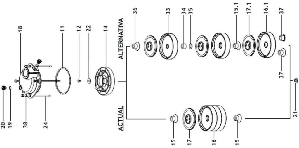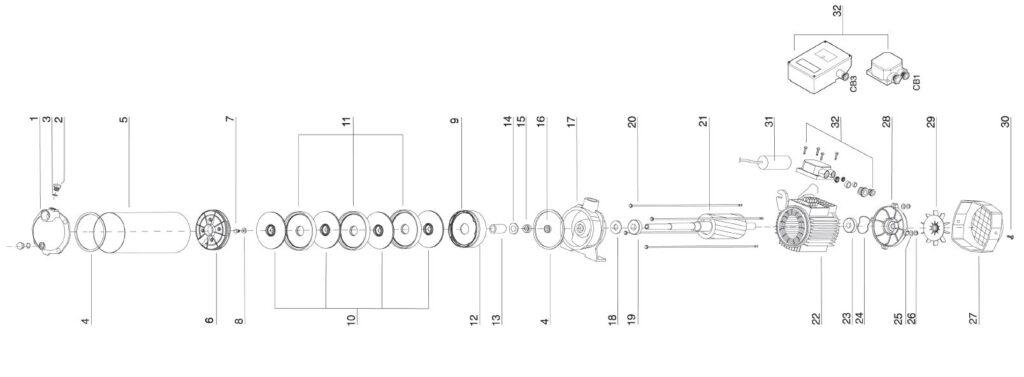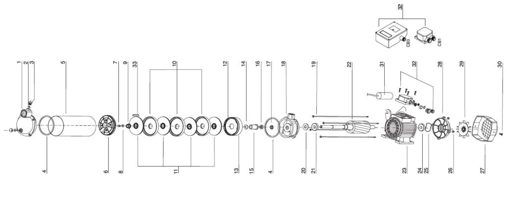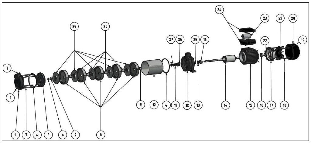 Sie finden Ersatzteile wie: Kondensator, Gleitringdichtung, Luftabscheider, Leitrad, Lüfterrad, Deckel für Lüfterrad, Buchse, O-Ring, Laufradkern, Klemmkasten, O-Ring, Dichtring, Einfüllstopfen,  Lüfterdeckel, Lüfterrad, Manteldichtung, Laufradschraube, Unterlegscheibe, Buchse für Laufrad, Pumpenmantel, Druckgehäuse, Gewindestange, Zuganker, Welle, Motor, Stator, Klemmkasten, Sauggehäuse, Lippen Dichtring, Lippendichtung, Lager, Rillenkugellager, Aluminium Lagerdeckel.